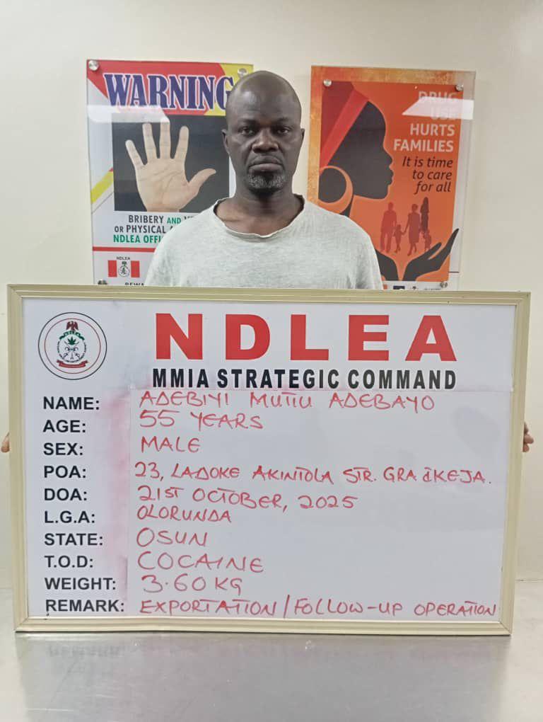 A statement by the spokesman of the anti-narcotics agency, Femi Babafemi on Sunday stated that the cocaine consignments weighing 3.6 kilogrammes were discovered on 14th October 2025 during examination of cargoes packaged as personal effects going to London, UK on an Air Peace flight.