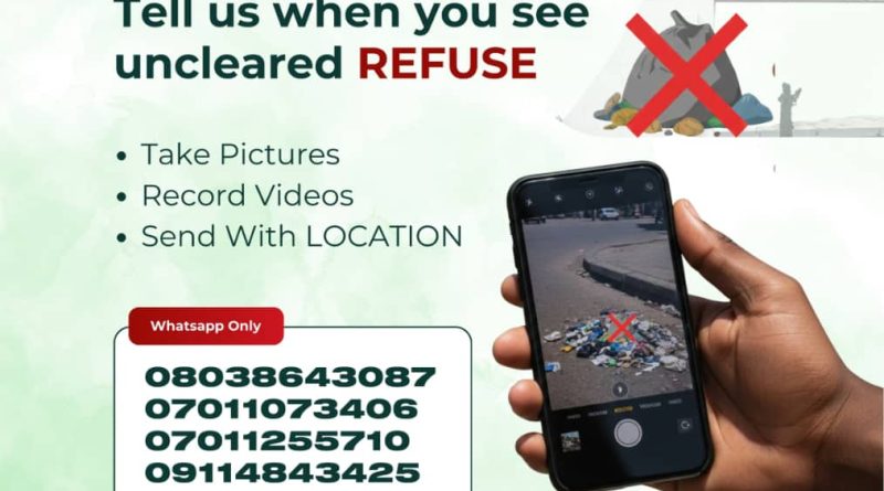 Senior Special Assistant to the FCT Minister on Public Communications and Social Media, Lere Olayinka, urged members of the public to send pictures and videos of uncleared refuse to the phone numbers through WhatsApp.