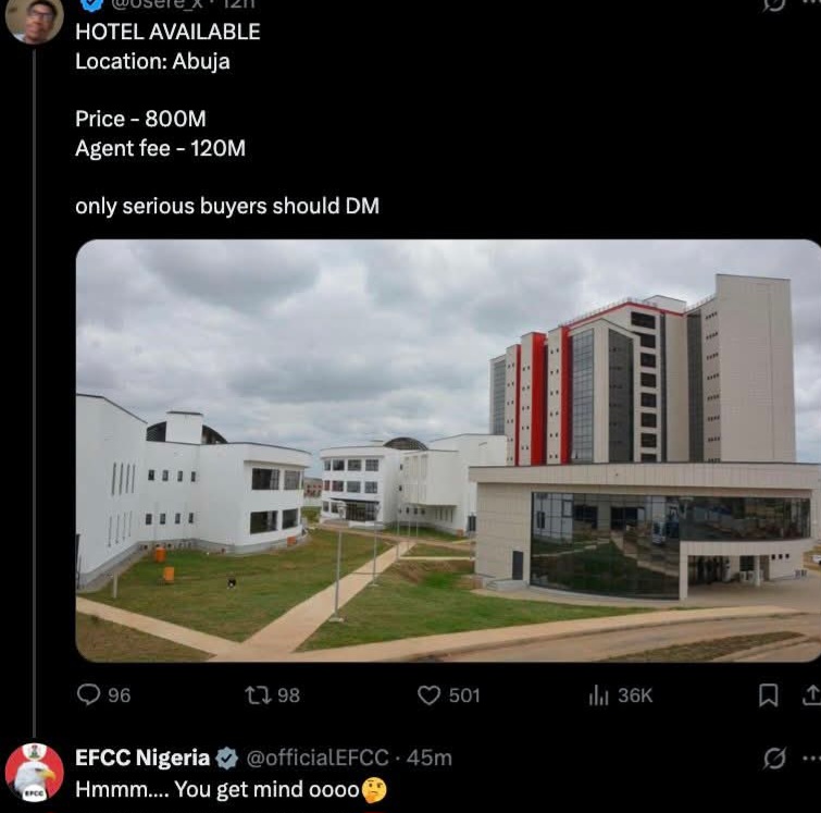 An X user with username @Osere has listed Abuja office of the Economic and Financial Crimes Commission, EFCC,as hotel for sale.